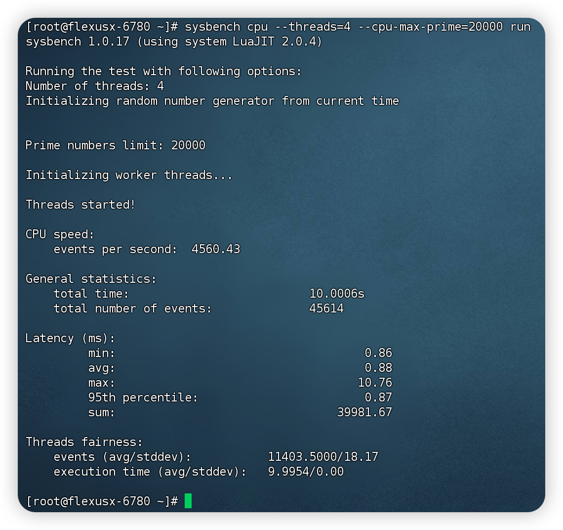 运行多线程 CPU 性能测试 shell sysbench cpu --threads=4 --cpu-max-prime=20000 run