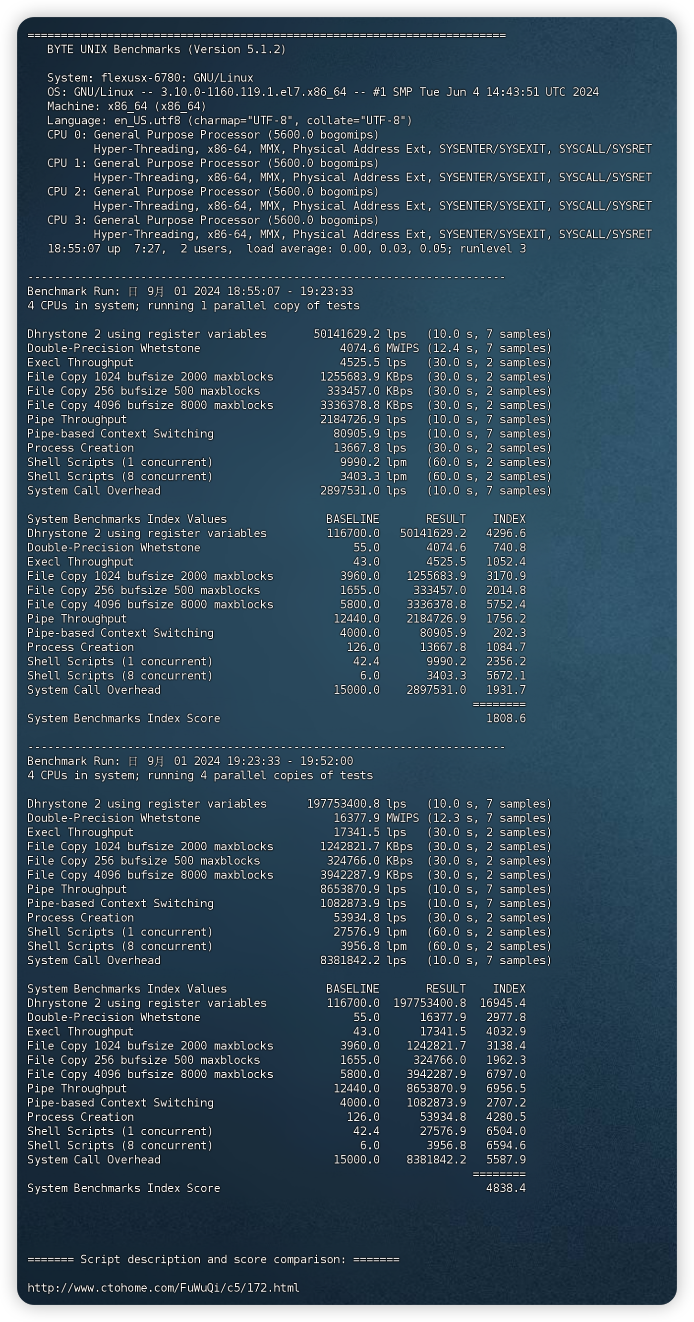 Flexus X 实例的系统性能的各项测试得分综合值是 4838.4,得分还是挺高的,这也表示 Flexus X 实例具有较好的性能表现。通常来说 UnixBench 在服务器上的跑分数值越高,其系统性能就越好。