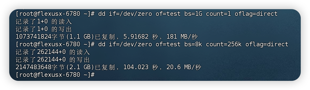 # 大文件写入测试 dd if=/dev/zero of=test bs=1G count=1 oflag=direct# 批量小文件写入测试 dd if=/dev/zero of=test bs=8k count=256k oflag=direct