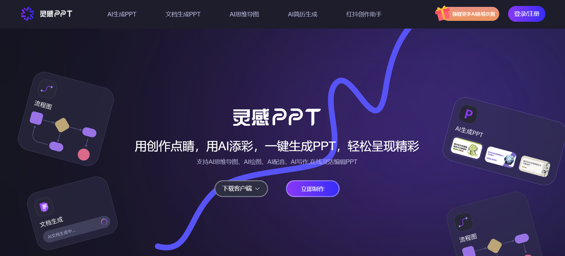 灵感PPT,作为一款集AI技术于一体的在线PPT制作平台,致力于简化PPT的制作流程。无论是指定主题的一键生成,还是上传文章的快速总结成PPT,灵感PPT都能轻松应对。其内置的AI思维导图、AI配图、AI写作、AI配音等四大工具,更是覆盖了日常PPT制作的全部需求,让你在短时间内就能制作出既专业又美观的演示文稿。