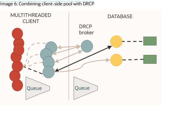 在这种模式下,应用程序代码与之前展示的多线程代码相同,但客户端会话池(如 Java 中的 UCP)通过 DRCP 连接到数据库。当工作线程调用以获取会话时,会发生以下两件事:
