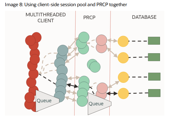 与 DRCP 一样,客户端可以是单线程的。当客户端需要会话时,它们从 PRCP 内部的可用池中分配一个会话。由于池化操作不再由数据库执行,PRCP 节省了数据库资源。但这也引入了一个额外的网络跳跃(network hop),即应用程序与数据库之间需要通过代理服务器进行中转。