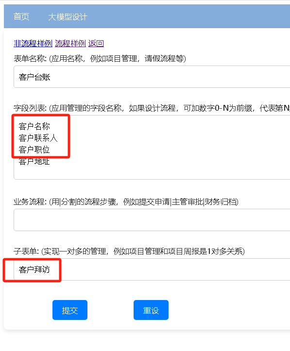 大模型设计子表关联的方法非常简单,现将子表单设计好,然后再设计主表单,将需要关联的字段使用相同的名字即可,也可以通过表单字段配置进行调整。
