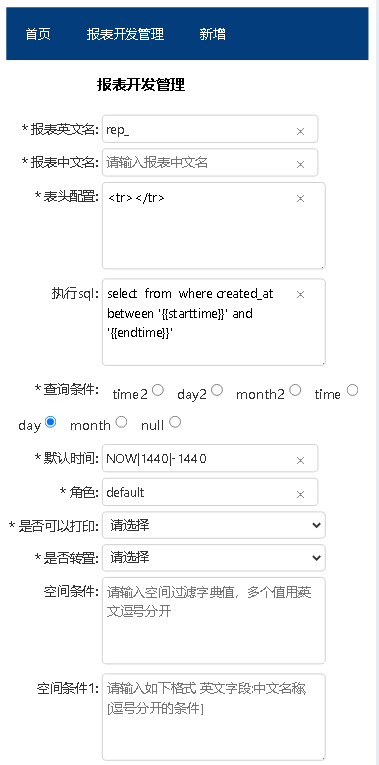 报表开发管理主要配置如下,设计的思路是将表头配置、查询条件配置、数据查询条件,安全配置都开放给用户,用户可以根据实际报表的复杂度,可以设计多行表头、基于单个时间和时间段的查询,支持无时间、一个时间、两个时间的日报,月报等,并根据空间可以支持下拉选择和模糊查询的报表搜索能力,执行sql可以配置明细类数据,在考虑性能效率的同时,支持进行聚合汇总的sql配置,实现实时的数据汇总报表。