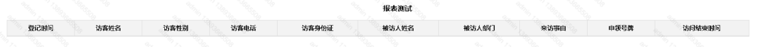 <tr><th>登记时间</th><th>访客姓名</th><th>访客性别</th><th>访客电话</th><th>访客身份证</th><th>被访人姓名</th><th>被访人部门</th><th>来访事由</th><th>申领号牌</th><th>访问结束时间</th></tr>