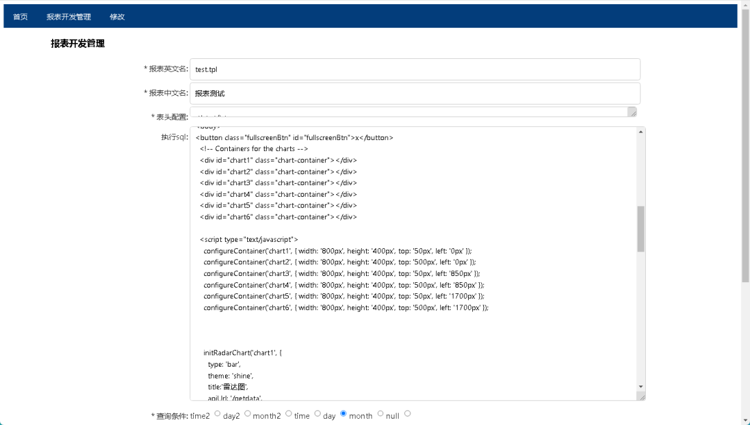 在报表开发中,“报表名称”设置为tpl为后缀,在“执行sql”中配置html和js脚本