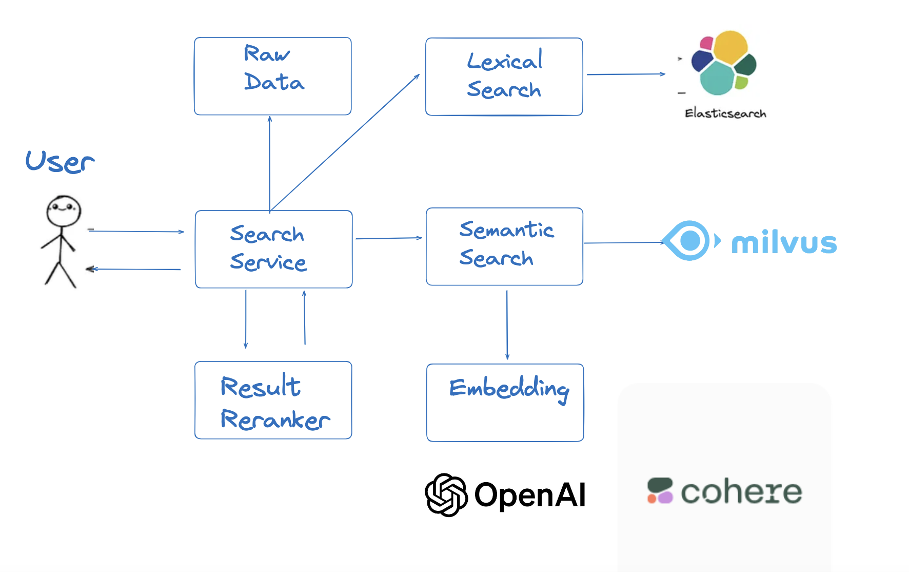 利用 LangChain 或 LlamaIndex 等框架,快速构建一个用于 POC(概念验证)的 Hybrid Retriever 相对简单。然而,构建一个面向海量数据的生产级解决方案则充满挑战。通常情况下我们需要使用专门的Vector Database进行高效的语意检索,同时还需要传统搜索引擎进行关键词检索,以下是一个生产可用的混合检索系统的架构示意图: