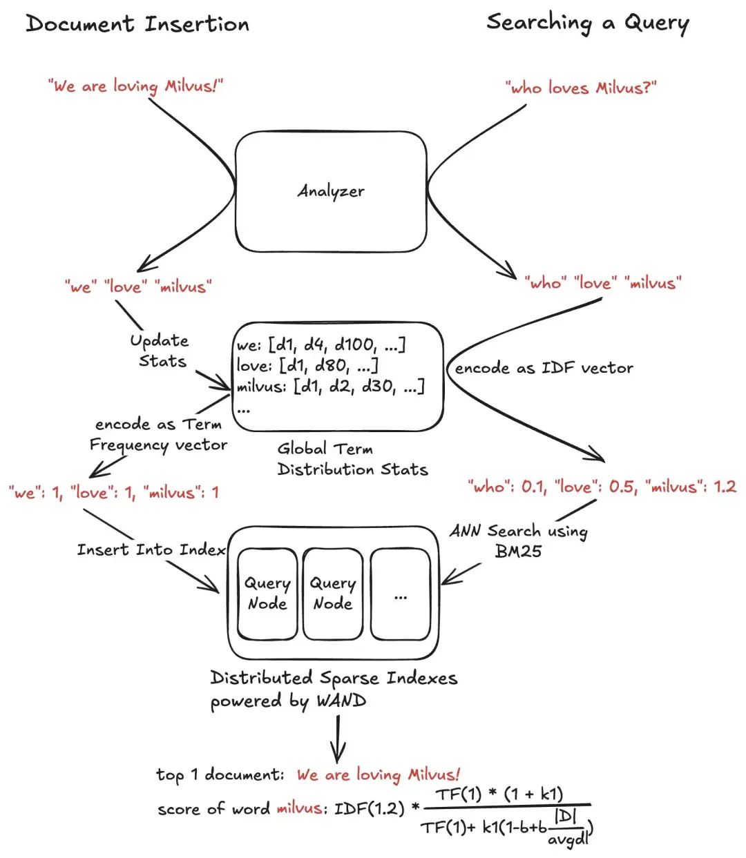 稀疏向量生成与相似度计算:通过语料库的词频(Corpus TF)构建稀疏向量,并基于查询词频(Query TF)和全局逆文档频率 (IDF) 构建查询稀疏向量,再通过特定的 BM25 距离函数进行相似度计算。