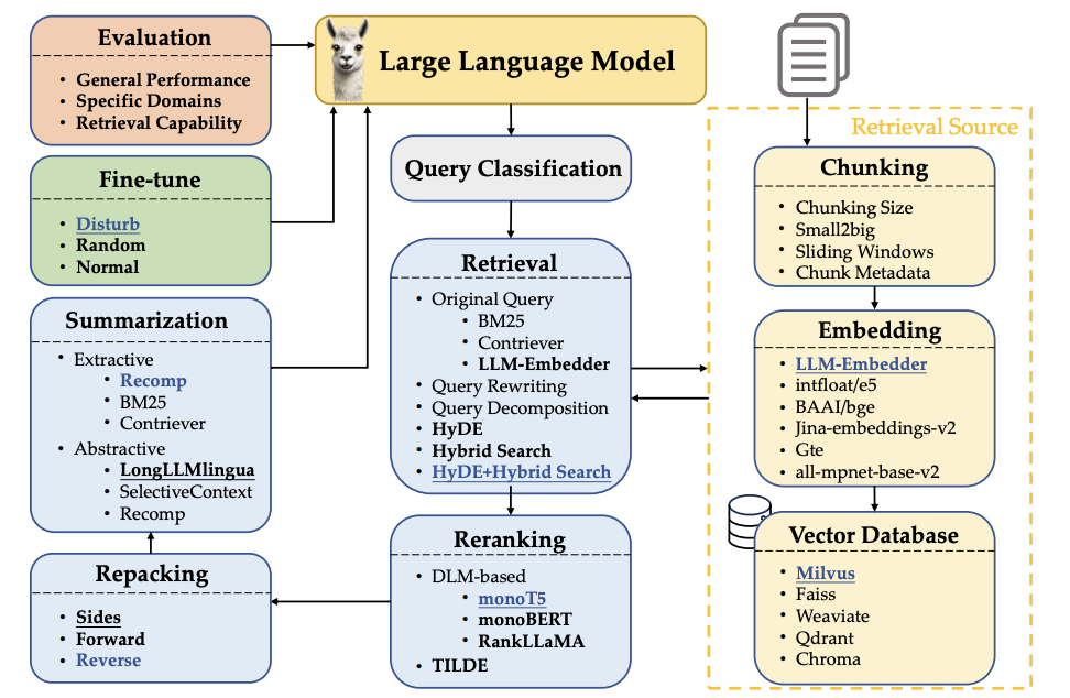 检索增强生成(RAG)技术已被证明在整合最新信息、减少幻觉(即模型产生不准确或虚构的信息)以及提升响应质量方面特别有效,尤其是在专业领域。典型的RAG工作流程通常包含多个干预处理步骤:查询分类(确定是否需要为给定输入查询进行检索)、检索(高效获取查询的相关文档)、重排序(根据文档与查询的相关性调整检索到的文档顺序)、重组(将检索到的文档组织成更有利于生成的结构)、摘要(从重组后的文档中提取关键信息以生成响应,并消除冗余)模块。实现RAG还需要决定如何适当地将文档分割成块、使用什么类型的嵌入表示这些块的语义、选择哪种向量数据库以高效存储特征表示,以及有效微调LLMs的方法。