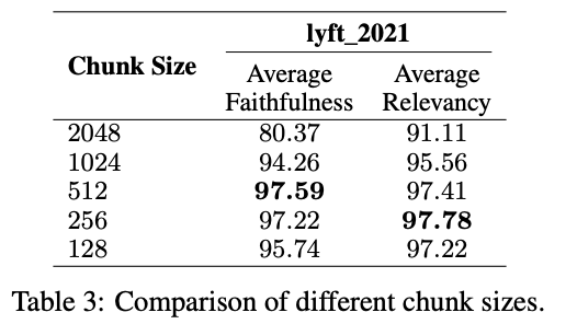 块大小对性能有显著影响。较大的块提供了更多的上下文,有助于增强理解,但会增加处理时间。较小的块可以提高检索召回率并减少处理时间,但可能会缺乏足够的上下文。研究了不同块大小对系统忠实度和相关性的影响,其中忠实度衡量的是生成的响应是否忠实地反映了检索到的文档内容,相关性衡量的是检索到的文档和生成的响应是否与用户的查询匹配。