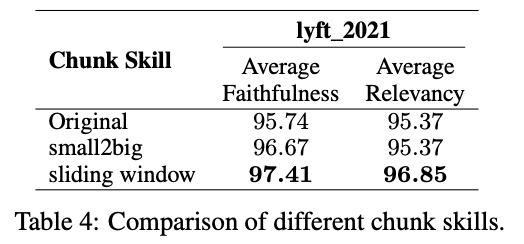 为了展示高级分块技术的有效性,我们使用了LLM-Embedder模型作为嵌入模型。较小的块大小为175个词元,较大的块大小为512个词元,块重叠大小为20个词元。像“小到大”和滑动窗口这样的技术通过维持上下文并确保检索到相关信息来提高检索质量。