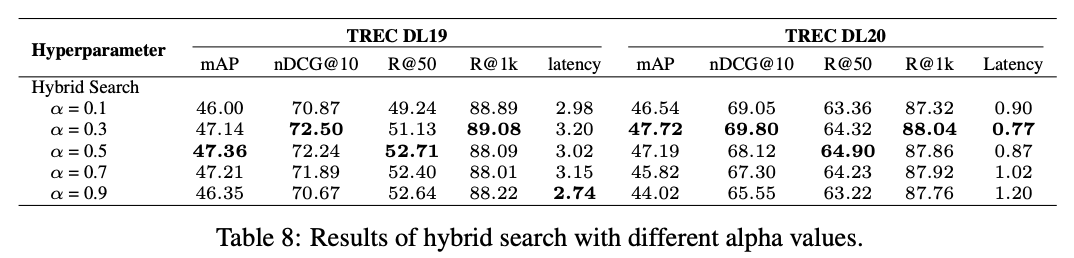 在这篇文章推荐使用带有HyDE的混合搜索作为默认检索方法,采用单个假设文档。从效率角度来看,混合搜索结合了稀疏检索(BM25)和密集检索(原始嵌入),并在相对较低的延迟下实现了显著的性能。并且使用 α 控制稀疏检索和密集检索组件之间的权重,结果显示,α 值为0.3时性能最佳。