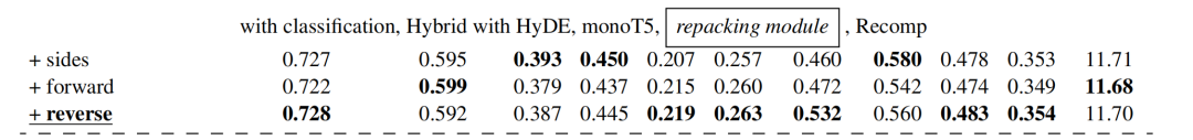 重排序模块:缺少重排序模块会导致性能明显下降,突出了该模块的必要性。MonoT5取得了最高的平均得分,证明其在提升检索文档相关性方面的有效性。这表明重排序在提高生成响应质量方面具有关键作用。