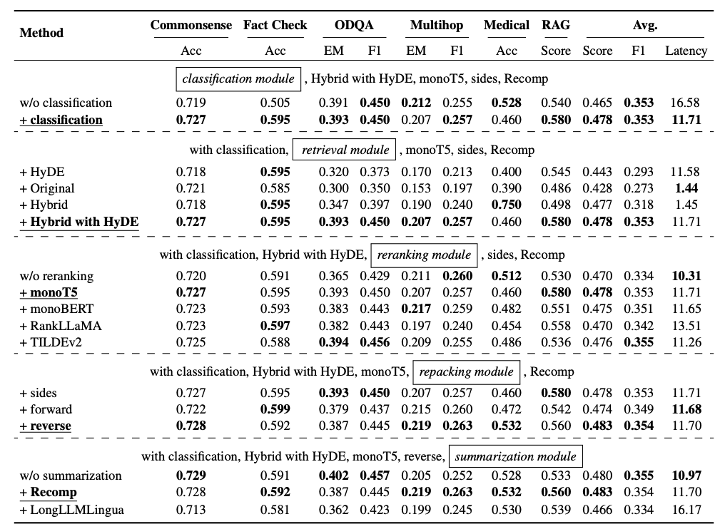 实验结果表明,每个模块都对RAG系统的整体性能有独特的贡献。查询分类模块提升了准确性并降低了延迟,而检索和重排序模块显著提高了系统处理多样化查询的能力。重组和摘要模块进一步优化了系统输出,确保在不同任务中提供高质量的响应。