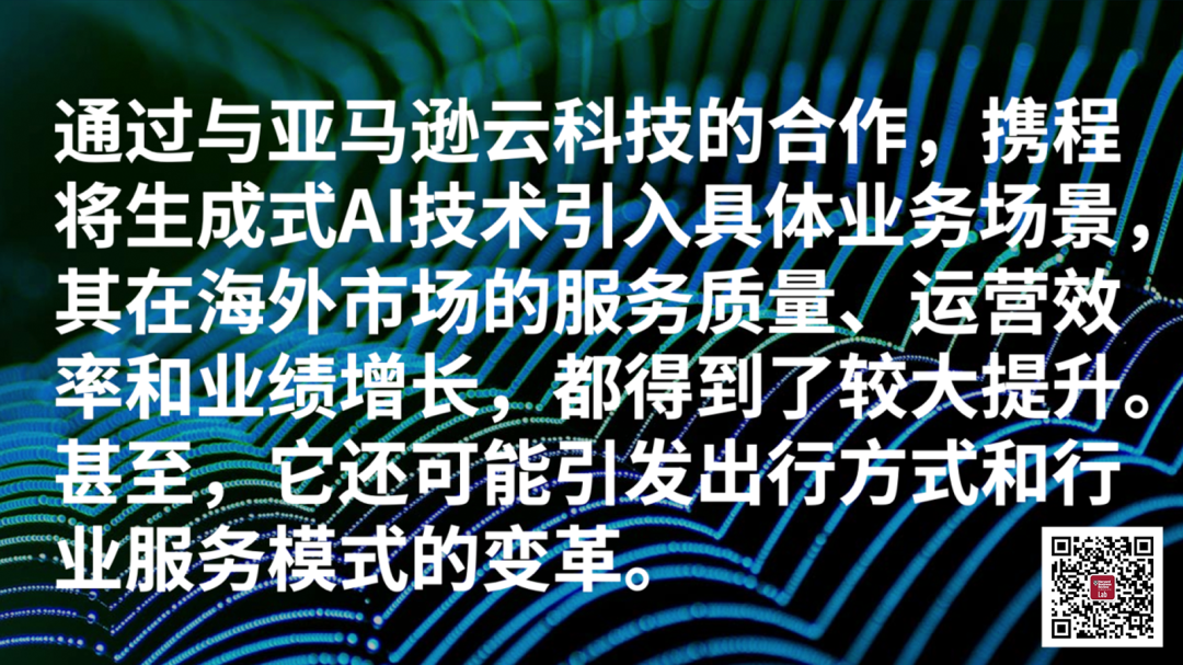 当“出海”和“AI”这两张时下最为热门的标签,同时出现在一个公司身上,会是一个什么样的情形?通过与亚马逊云科技的合作,携程将生成式AI技术引入具体业务场景,特别是在机票舱位预测、航班计划变更处理、多语种翻译等关键场景中,其在海外市场的服务质量、运营效率和业绩增长,都得到了较大提升。甚至,它还可能引发出行方式和行业服务模式的变革。携程的出海战略在生成式AI技术的助力下,正迎来前所未有的发展机遇。它是如何做到的?
