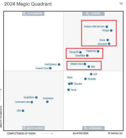 Gartner 刚刚发布了 2024 年云数据库魔力象限 (Magic Quadrant for Cloud Database Management Systems)。作为业界最具权威的评测报告,我们来快速过一下这次厂商们的排名。