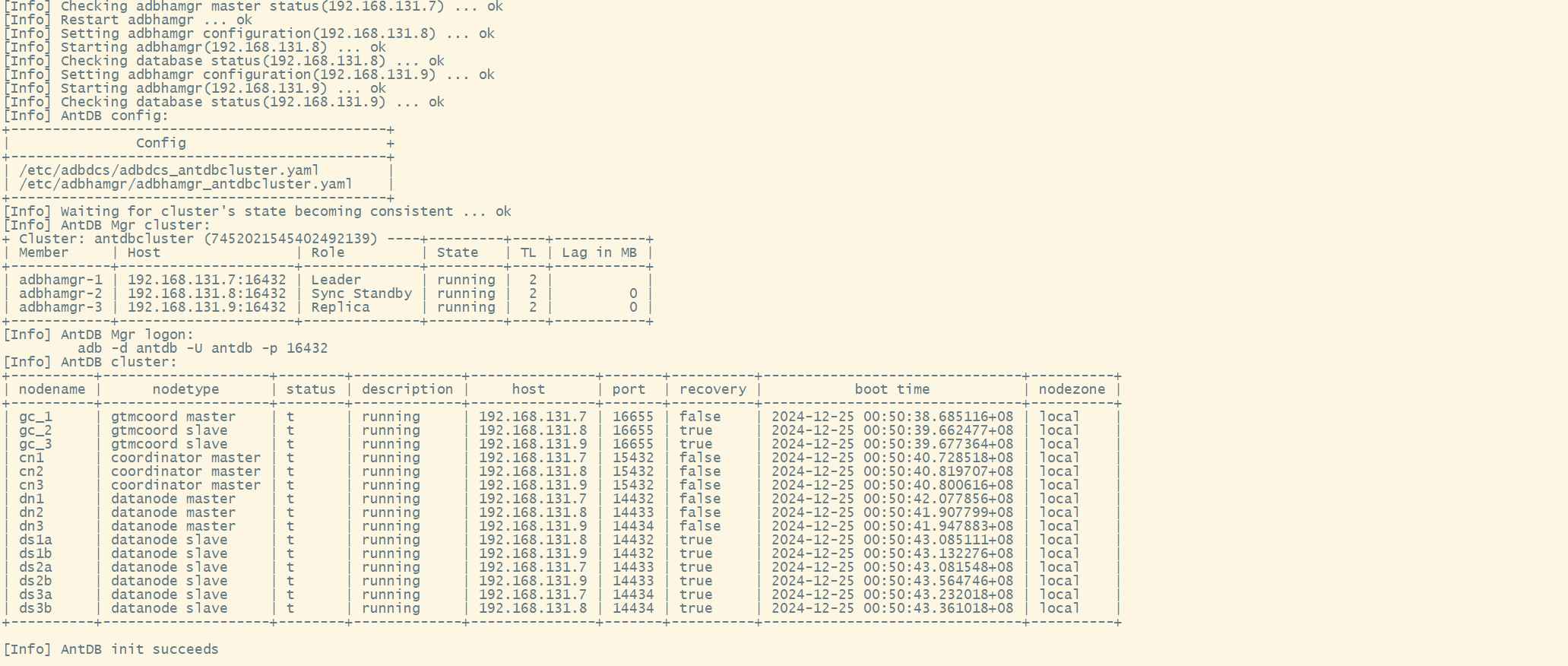 dn3 | datanode master | t | running | 192.168.131.9 | 14434 | false | 2024-12-25 00:50:41.947883+08 | local