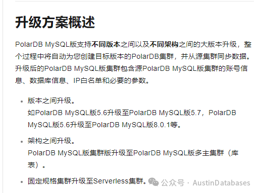 这里如果你一开始使用的是PolarDB for MySQL 5.7后续想升级到MySQL8.0那么完全可以使用大版本升级功能,直接升级到8.0的PolarDB for MySQL.