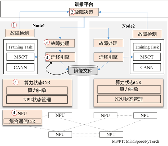 随着大模型技术的发展和其训练规模的不断扩大,集群的故障问题也日益凸显,严重影响模型训练的效率;例如,Meta AI实验室发布的OPT模型,其中OPT-175B[1]的训练时长90天( 900多张GPU),训练期间112次故障,故障恢复时间耗时长,最长一次甚至到80小时;OpenAI GPT-4[2]的训练时长90~100天(2万多张GPU),算力利用率MFU仅32%到36%,而故障恢复涉及的高开销检查点则是低MFU的关键所在。因此,如何快速恢复模型续训提高集群训练的可靠性成为亟待解决的技术难题。1) 故障检测:检测系统中各种类型的故障,故障发生后,通知故障决策组件;2) 故障决策:收到通知后,针对不同的故障类型决策采取何种恢复机制,通知故障处理组件进行故障处理;3) 故障处理:收到故障决策组件的消息后,进行故障处理,如临终状态处理,数据修复等;4) 故障恢复:故障节点进程进行原地恢复或者迁移恢复等,正常节点任务需要回滚到指定的训练步骤,主要涉及关键技术有NPU设备和集合通信的状态保存与恢复。
