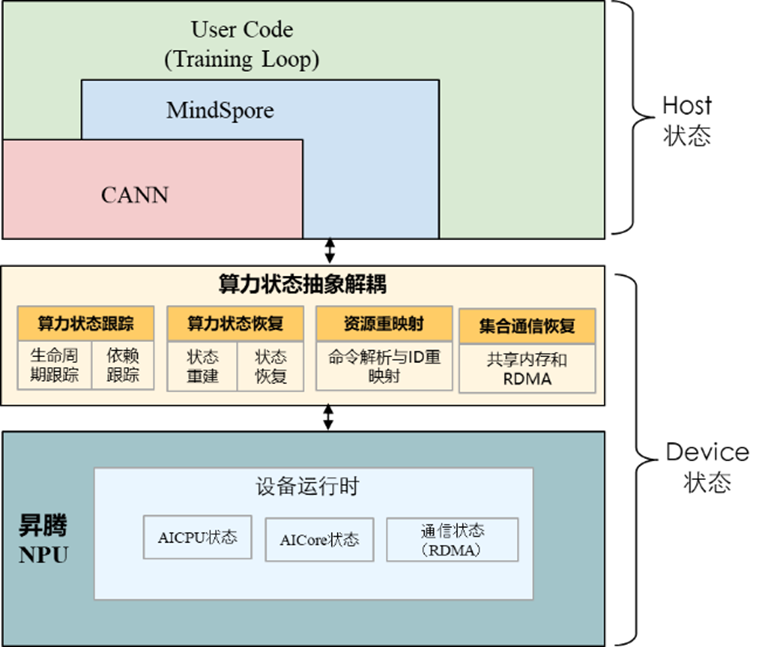 大模型训练的运行状态主要分为两部分,一部分是训练任务相关的,包括大模型, MindSpore, CANN , 这些状态可以通过CRIU[3]恢复;另外一部分与NPU设备相关(包括NPU driver和NPU device)的。虽然用户态的CRIU机制可以恢复进程的状态,但不支持NPU设备相关状态恢复。由此,AMD[5]和Nvidia[6]积极推动各自的GPU驱动里实现状态保存和恢复的能力;微软 Singularity[4]则通过劫持技术,截获CPU与GPU之间的交互,通过一个独立的设备代理组件实现GPU设备状态恢复。与GPU不同的是,NPU的状态更加复杂,除了NPU Driver状态之外,NPU设备内部还有复杂的管理机制,需要保存与恢复相关状态信息。为此,我们构建了算力状态抽象管理模块,用于跟踪、管理与恢复主机侧到NPU侧发送的命令与算子流,记录命令的生命周期、依赖关系等,并通过重算(例如算子)的方式构建NPU内部状态;同时通过适配Driver,提供Dump和Restore接口,保存和恢复必要的数据。