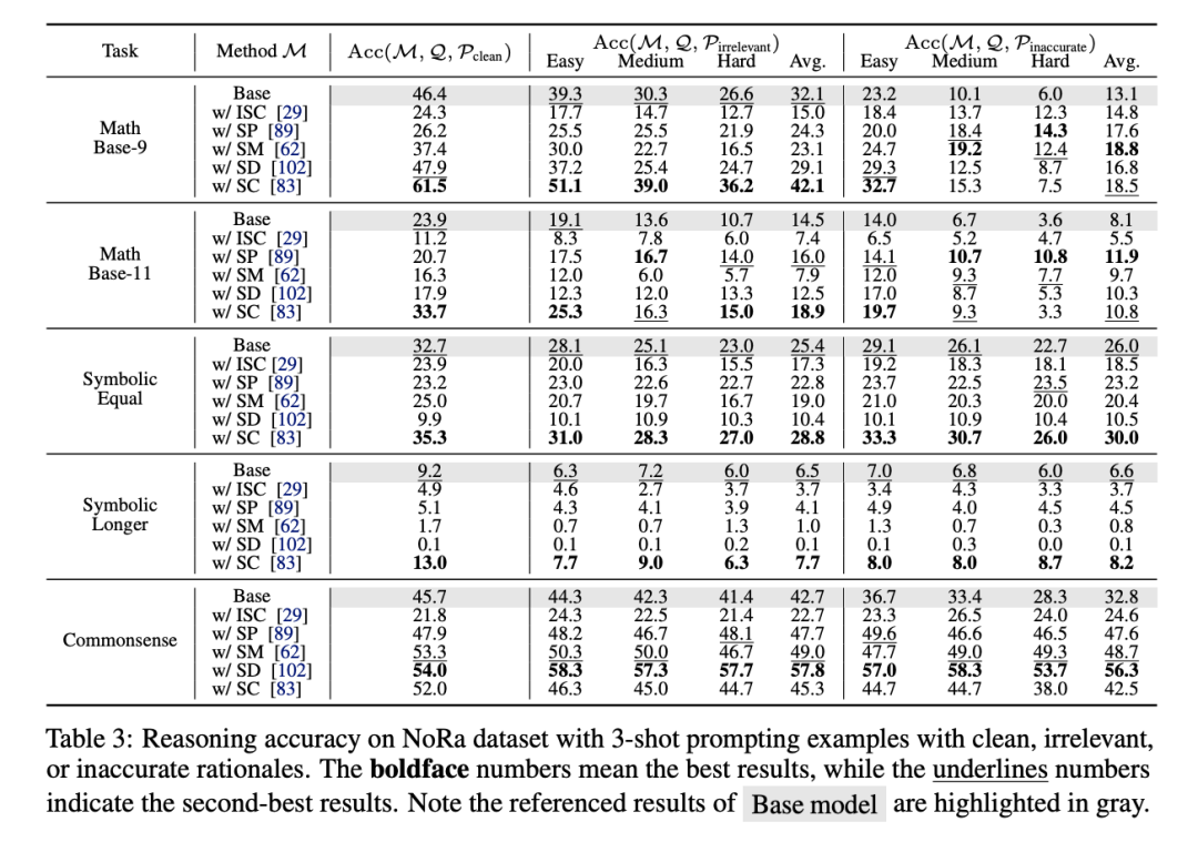 限制性问题:在高噪声场景(如NoRa-Math任务)中,示例数量的增加反而会降低准确率,尤其在某些任务中表现甚至不如0-shot的水平。