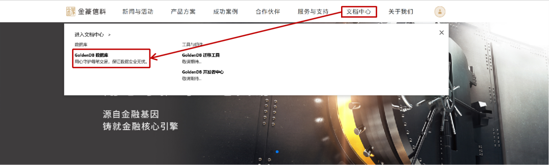 (2)在顶端【文档中心】下点击【GoldenDB数据库】,即可查阅。