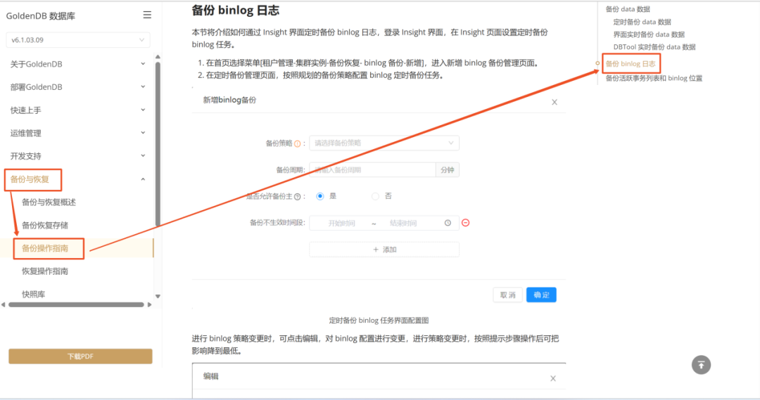 如您需要了解在备份过程中,如何通过insight界面备份binlog日志:在左侧目录选择【备份与恢复】,点击【备份操作指南】,然后在右侧页面导航栏中点击【备份binlog日志】,即可快速定位到该板块。