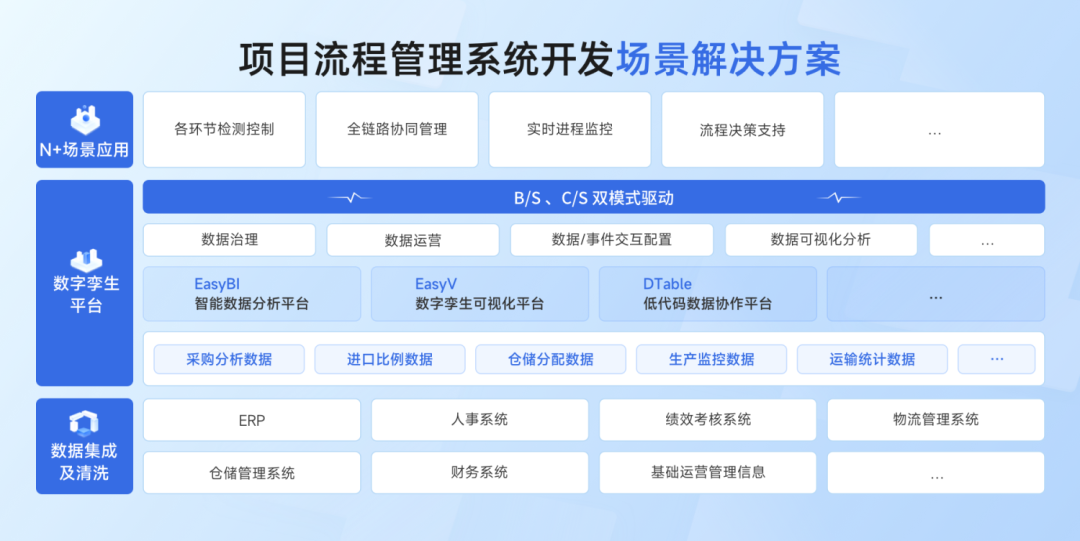 基于以上场景需求,易知微依托深厚的技术底蕴与大数据应用经验,解决了各行业企业项目流程管理中面临的技术发展、市场需求和生产管理等多个维度的难题。针对中小型企业全面打造项目流程管理系统开发场景解决方案,从业务流程管理、数据资源驱动等维度入手,以与核心业务紧密关联的最小业务单元作为核心切入点,助力中小企业实现数字化转型⬇️。