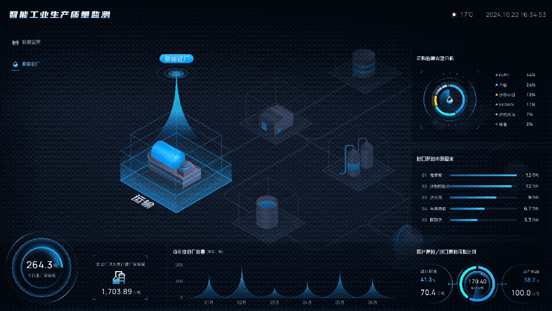 以制造业为例,易知微的「项目流程管理系统」综合了采购、仓储、生产和运输等各行业重点关注数据,利用基本柱状图、轮播环图、轮播排行条形图、象形图、基本环图等多元的可视化形式。面向领导、生产和采销等部门,通过多个业务系统获取数据,展示采购分析、进口比例、仓储分配、生产监控和运输统计等关键指标。可复用的业务场景丰富,比如:人事、财务、仓储、物流等管理,仅需替换文字、数据即可适用于实际项目。可以帮助管理者实时跟踪项目进度、运行效率、各环节消耗和全链路协同管理,全面优化了项目流程,提高了整体的运营效率。