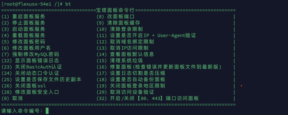1. 在服务器终端输入 bt 查看相关命令编号,输入 14 查看访问地址,并在浏览器中输入地址进行访问