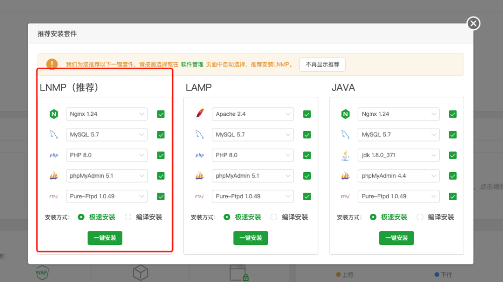 2. 进入宝塔面板,安装推荐的 LNMP 四件套, 四件套安装完成之后关于宝塔相关的配置已经完整的配置完成了哦,接下来我们就可以开启新的旅程了。