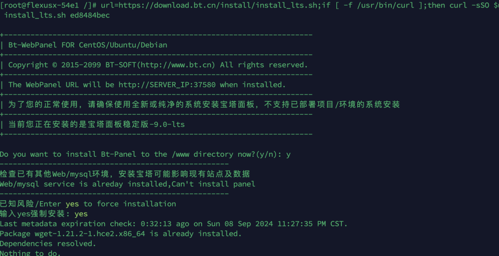 接下来安装我们的服务器搭子宝塔面板,下面是宝塔官方给出的服务器通用宝塔面板安装命令,直接复制到终端并回车安装即可
