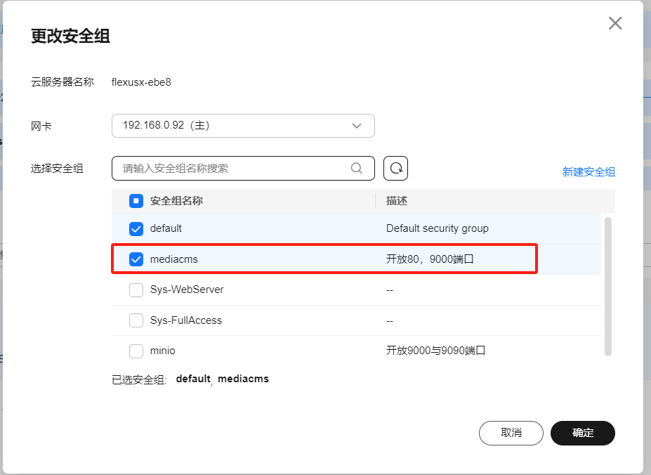 · 经过上面部署 mediacms 服务,这时候服务是已经部署完毕了,但是我们还没法通过外网进行访问,还需要对 Flexus 云服务器 X 安全组的配置进行修改