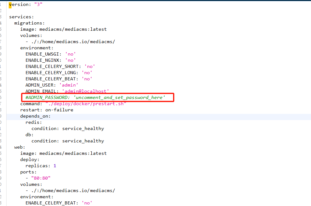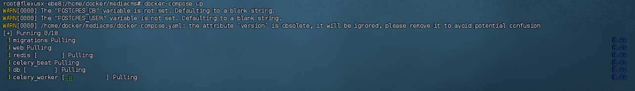 root@flexusx-ebe8:/home/docker/mediacms/mediacms-main# docker psCONTAINER ID IMAGE COMMAND CREATED STATUS PORTS NAMESroot@flexusx-ebe8:/home/docker/mediacms/mediacms-main# docker-compose up -dWARN[0000] The "POSTGRES_DB" variable is not set. Defaulting to a blank string.WARN[0000] The "POSTGRES_USER" variable is not set. Defaulting to a blank string.WARN[0000] /home/docker/mediacms/mediacms-main/docker-compose.yaml: the attribute `version` is obsolete, it will be ignored, please remove it to avoid potential confusion[+] Running 6/6 ✔ Container mediacms-main-redis-1 Healthy 30.7s ✔ Container mediacms-main-celery_beat-1 Started 0.4s ✔ Container mediacms-main-db-1 Healthy 10.2s ✔ Container mediacms-main-migrations-1 Started 30.9s ✔ Container mediacms-main-celery_worker-1 Started 31.2s ✔ Container mediacms-main-web-1 Started