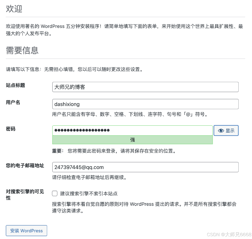 填写站点标题,用户名,密码,以及点子邮箱,点击安装即可。此处需要注意,这里的用户名和密码就是博客后台的管理员用户名和密码,请牢记。
