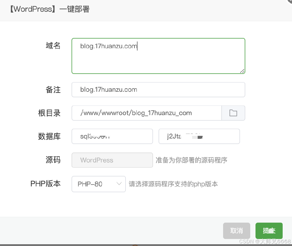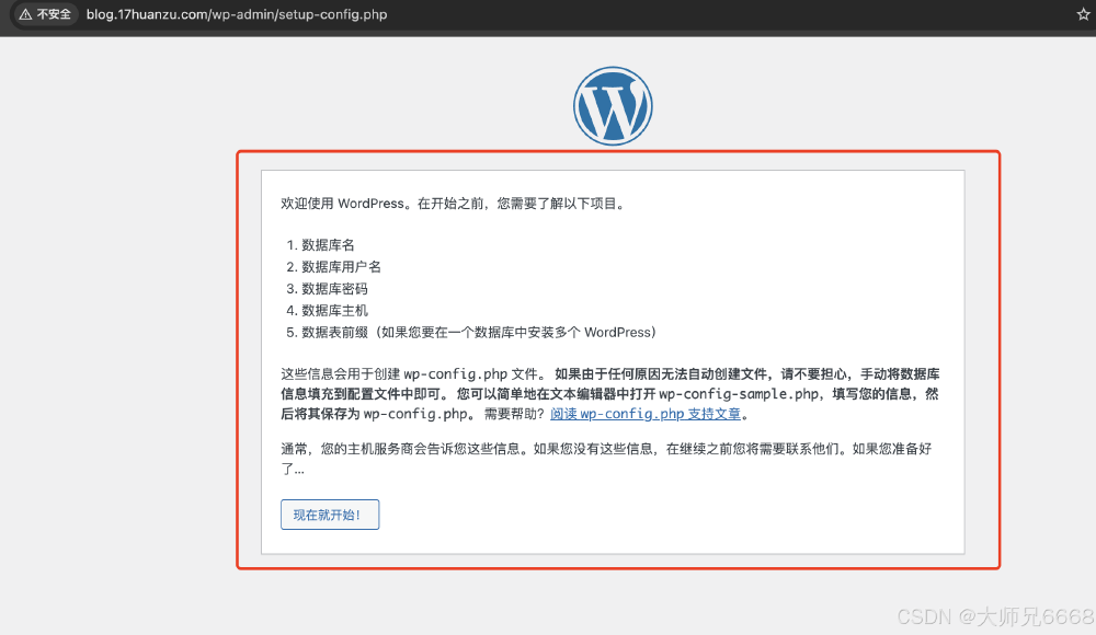 按照提示,点击“现在就开始!”即可跳转到数据库配置页面,进行数据库配置。所需数据库信息在一键部署成功的弹窗中获取,其他的默认值保持不变,或者根据自己的爱好调整即可。