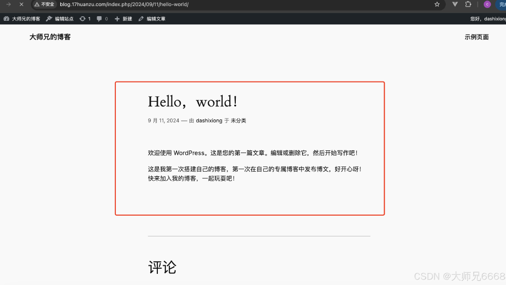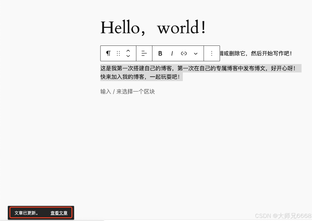 我们修改一下标题为:Hello,world!然后增加正文内容:这是我第一次搭建自己的博客,第一次在自己的专属博客中发布博文,好开心呀! 快来加入我的博客,一起玩耍吧!保存发布一下,查看效果。