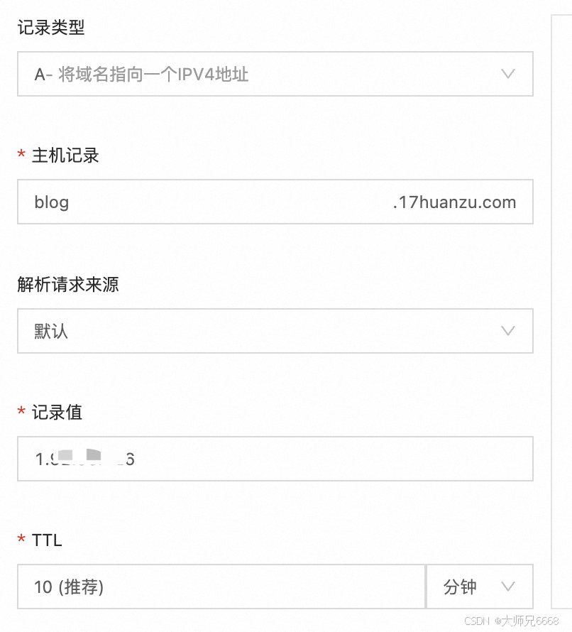 如果无法访问站点,检查是否将域名做了解析,我这里是用的阿里云的域名解析,在里面添加一条解析记录即可,如果是直接用服务器 IP 的小伙伴,需要注意,如果上一个建站操作你已经用了服务器 ip 地址,这里如果再用的话,可能会导致之前的网站不能用,因为这两个默认都是 80 端口访问,如果需要区分开来,需要自己在宝塔的网站相应配置中,修改 nginx 配置即可,此处我演示用域名来进行解析。在域名解析中,添加一个 A 类型的解析,然后主机记录填写刚刚定义的 blog,记录值填写自己的服务器的外网 IP 地址,然后点击确认即可添加。