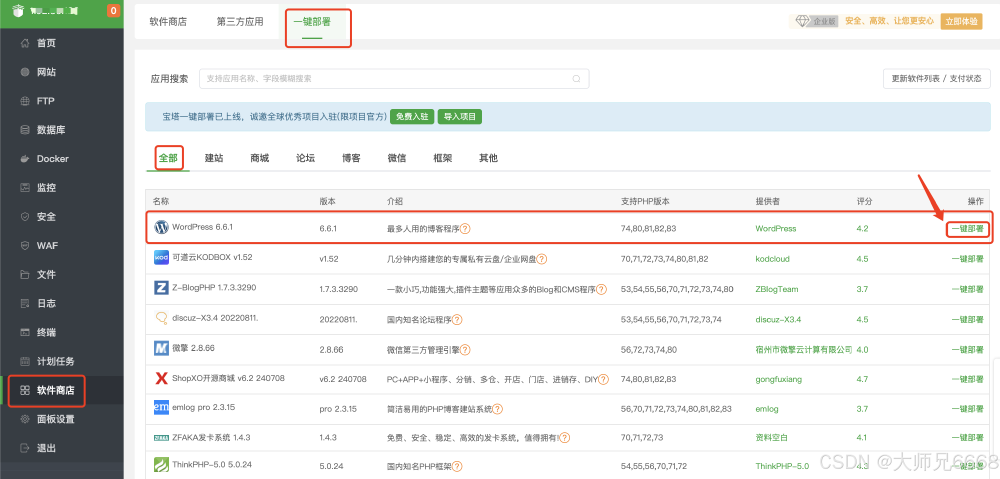 2. 在商店中选择“全部”,然后选择“WordPress 6.6.1”,点击“一键部署”按钮,进入部署界面。