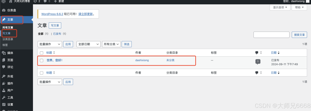 在后台的“文章”-”所有文章“-”写文章“,可以添加新的博文,然后发布。这里看到系统已经默认写了一篇,我们进行修改即可。