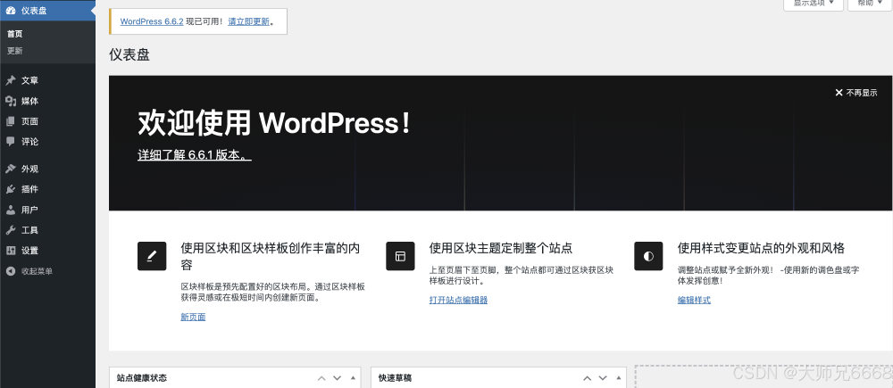 成功登录后,将看到管理后台页面。在这里可以配置博客的各种内容,包括布局,发博文等等。