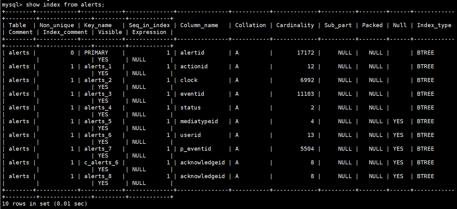 alter table alerts drop index alerts_1,add index alerts_1(actionid); 删除旧索引 新建新的特定索引