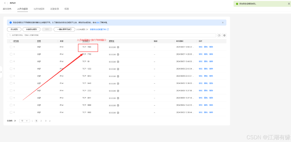 进入 Flexus 云服务器 X 实例控制台,进行安全组规则配置。在安全组入方向规则上,放行 7890 端口。