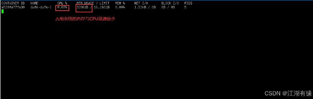 在检查 dufs 的资源占用情况后,我们发现 dufs 容器的实际资源消耗非常低,这表明它在资源利用上极为高效,不仅能留出更多空间给其他应用程序,同时也确保了服务器资源的合理分配与充分利用,提升了整体系统性能。