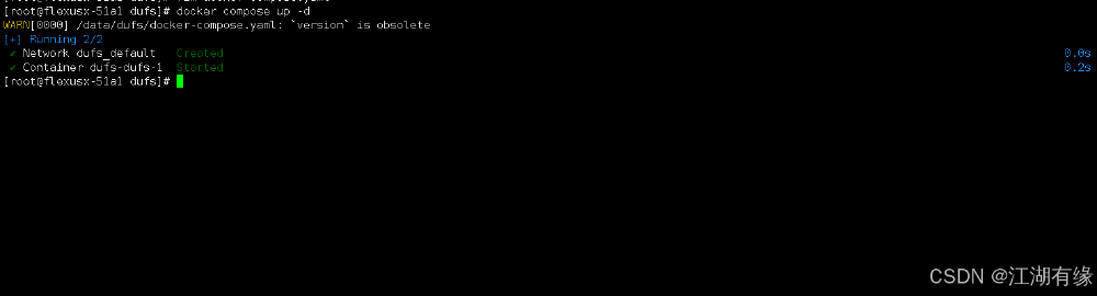 [root@flexusx-51a1 dufs]# docker compose up -dWARN[0000] /data/dufs/docker-compose.yaml: `version` is obsolete[+] Running 2/2 ✔Network dufs_default Created 0.0s ✔Container dufs-dufs-1 Started 0.2s