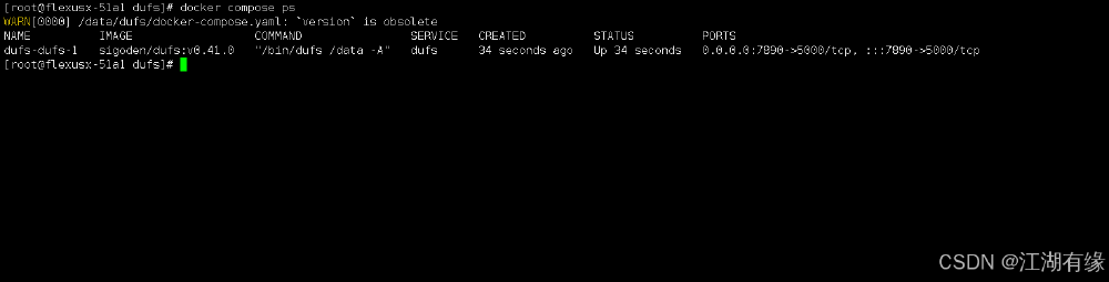 [root@flexusx-51a1 dufs]# docker compose psWARN[0000] /data/dufs/docker-compose.yaml: `version` is obsoleteNAME IMAGE COMMAND SERVICE CREATED STATUS PORTSdufs-dufs-1 sigoden/dufs:v0.41.0 "/bin/dufs /data -A" dufs 34 seconds ago Up 34 seconds 0.0.0.0:7890->5000/tcp, :::7890->5000/tcp