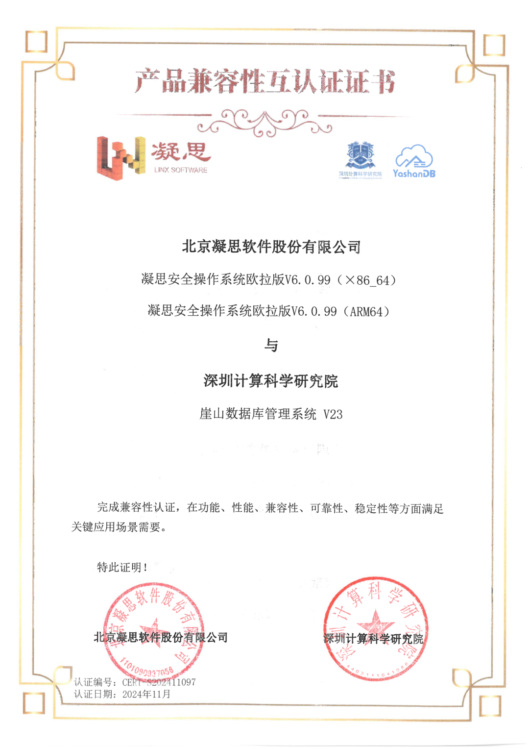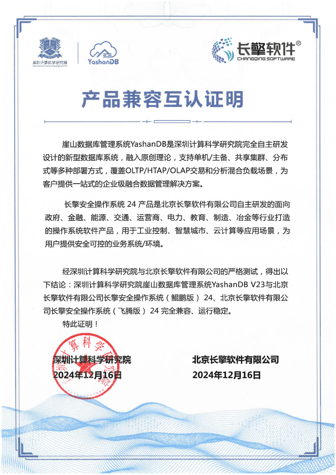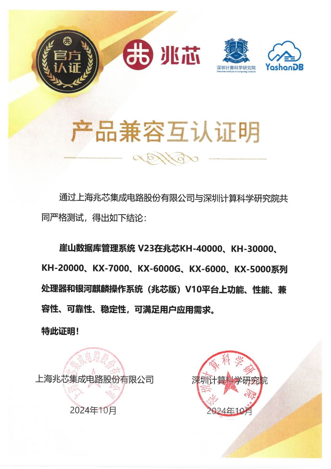 近期,深圳计算科学研究院崖山数据库系统YashanDB与飞腾、申威、麒麟、兆芯、北京凝思、超聚变、河南昆仑、麒麟信安、中科红旗、北京长擎等基础软硬件厂商多个产品完成兼容互认,实现了与国产基础软硬件广泛兼容,共同促进我国基础软硬件生态发展,共筑更坚实的数据安全城墙。