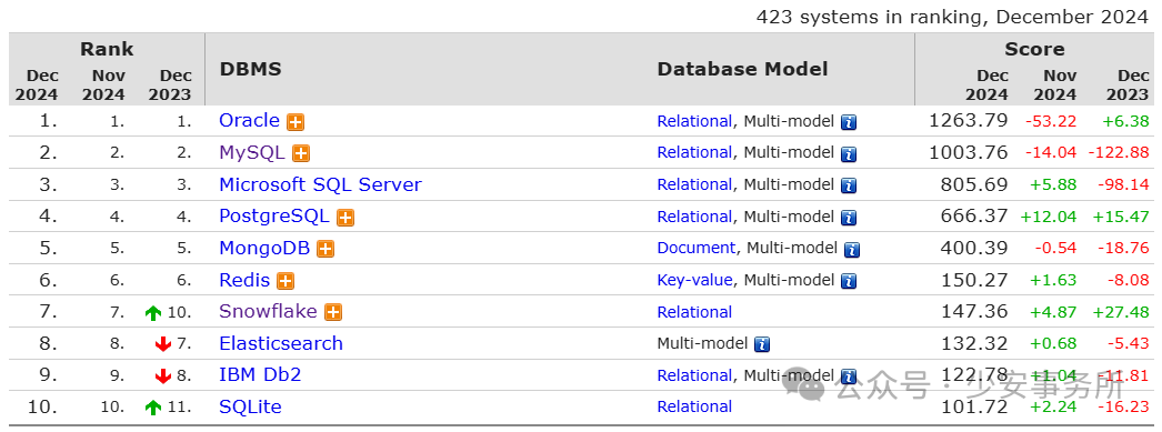在数据库技术的浩瀚海洋中,无论是新手还是资深专家,不论学何种数据库,都需要学习 Linux,毕竟绝大部分数据库都运行在 Linux 上,即便是工业常青树 SQL Server 也推出了 Linux 版本。在 OS 之上才是 Database,国产数据库这两年发展迅猛,预计在未来两年将会如充了“氮气”竞争更加激烈。12 月更新的 DB-Engines 全球流行度排行榜显示,Oracle 和 MySQL 数据库继续超过 1000 分,大幅领先于其他产品,PostgreSQL 分数较上月提升 12 分,站上 666 分,成为整个榜单 423 款产品中仅有的两款(PostgreSQL、Snowflake)同比分数上涨超 10 分的产品。