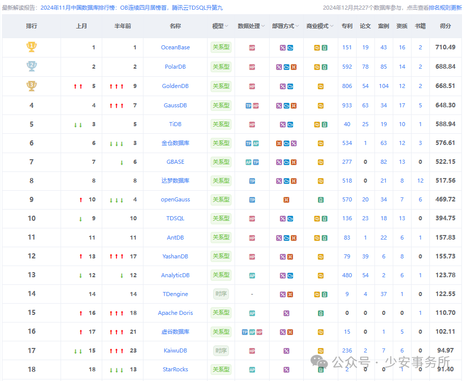 在中国数据库流行度排行榜的 227 个数据库中,80% 以上的产品都在努力实现 Oracle、MySQL、PostgreSQL(简称 MOP)兼容性,有多款产品是基于 MySQL 或 PostgreSQL 进行二次开发或硬分叉。