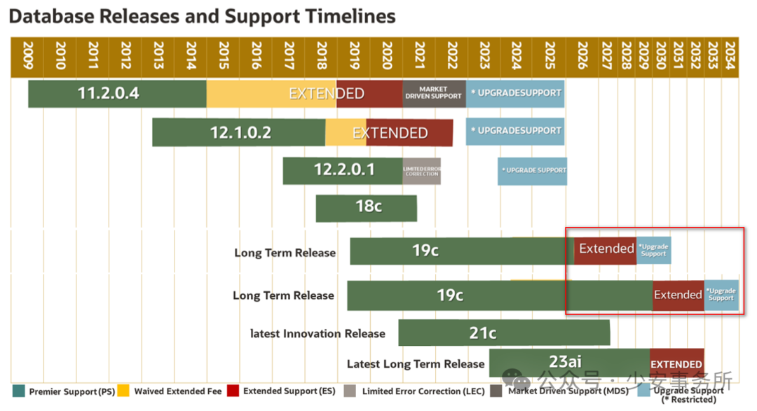 Oracle 19c 自 19 年正式发布以来,便广受客户好评,从 2024 甲骨文中国创新峰会了解到的讯息,Oracle 中国客户超过 26 万家。11 月 19 日,Oracle 的相关支持文档更新了 19c 的长期支持策略日期和路线图,主要支持结束时间延长到 2029 年 12 月 31 日,扩展支持延期到 2032 年 12 月 31 日,升级支持(有限可用性)截至 2034 年 12 月 31 日。这意味着 Oracle 19c 的支持周期比 23ai 更久,如果你已经在使用 19c,或者明、后年准备上线 19c,就不需要为选择 19c 或者升级到 23ai 而纠结,核心系统的数据库还是选择 19c 更稳。